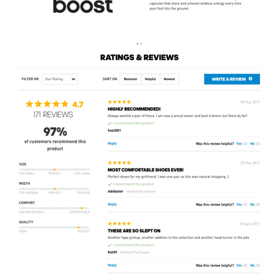 Adidas’ Product Page performance is mediocre. Notably, Adidas’ product page performance is hampered by mediocre Auxiliary Content and Specifications Sheet, although this is helped somewhat by good Product Images and decent Product Video & 360-View.