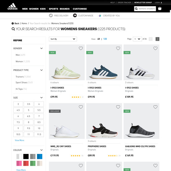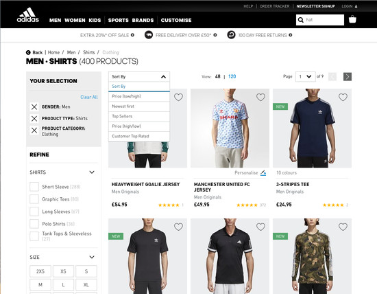 Adidas’ Product Lists & Filtering performance is decent. For instance, Adidas’ product listings have state of the art List Layout and good List Items: Interface & Hit Areas yet suffer from poor Sorting and broken Loading Products.