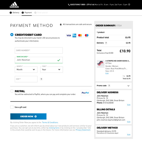 Adidas’ Cart & Checkout performance is decent. It is especially a state of the art Account Selection & Creation, Form & Page Design, and Cross-Sells that helps Adidas’ checkout UX. Do, however, watch out for their poor Field Design & Features performance.