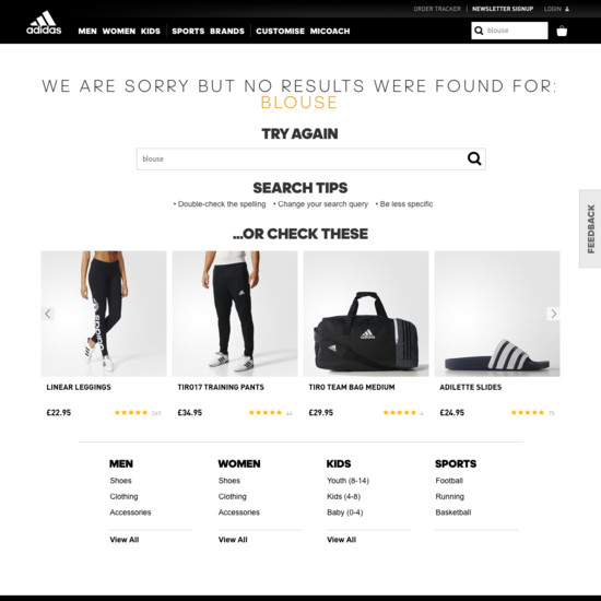 Adidas’ On-Site Search performance is poor. Some of Adidas’ biggest on-site search usability issues are due to broken Search Form & Logic, Search Query Types, and Results Logic & Guidance.