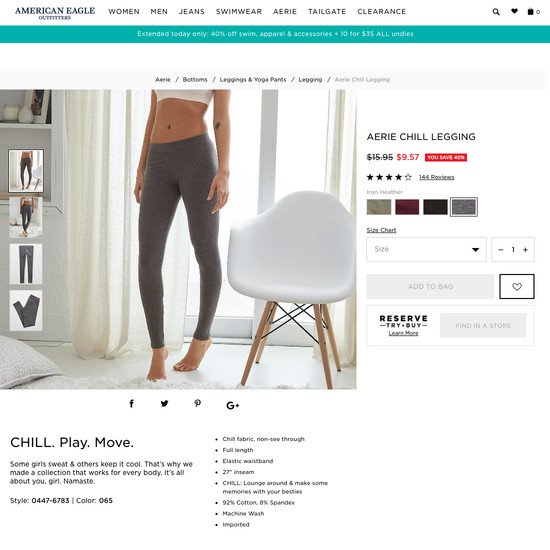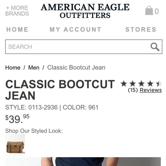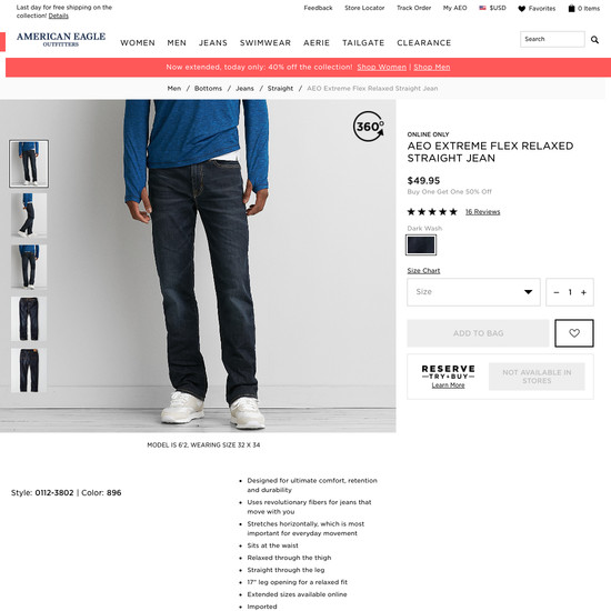 American Eagle Outfitters’ Product Page performance is poor. Some of American Eagle Outfitters’ biggest product page usability issues are due to mediocre Product Descriptions, mediocre Auxiliary Content, and poor Product Page Layout. That said, their product page experience performs well within Image Gallery UI.