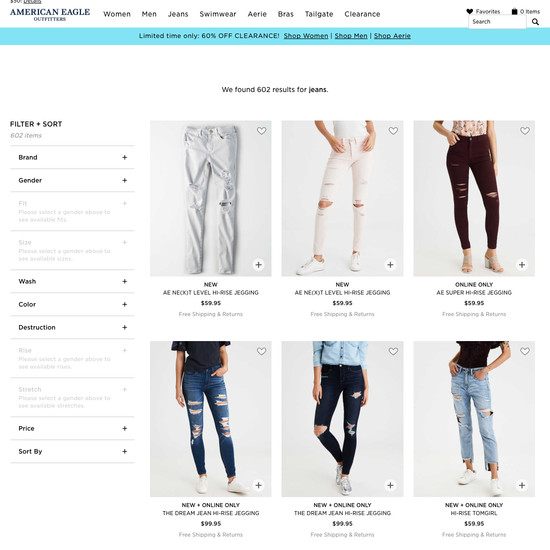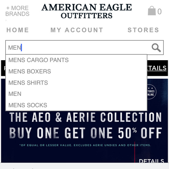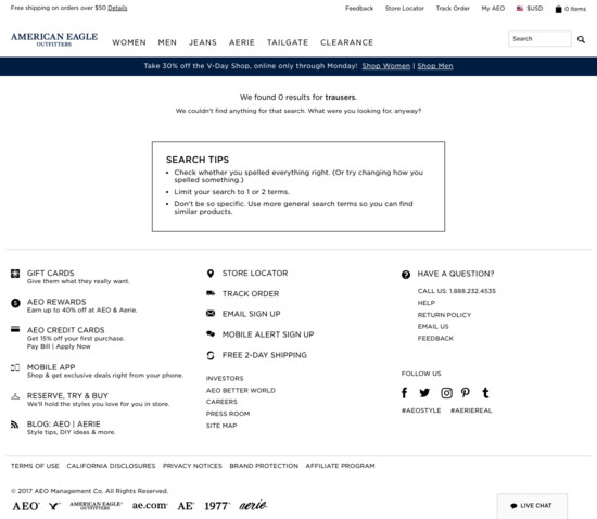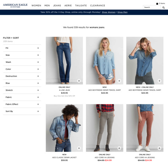 American Eagle Outfitters’ On-Site Search performance is mediocre. American Eagle Outfitters’ search experience in particular suffers from usability issues caused by mediocre Search Form & Logic, poor Search Query Types, and poor Results Logic & Guidance. That said, their search experience performs well within Search Autocomplete.