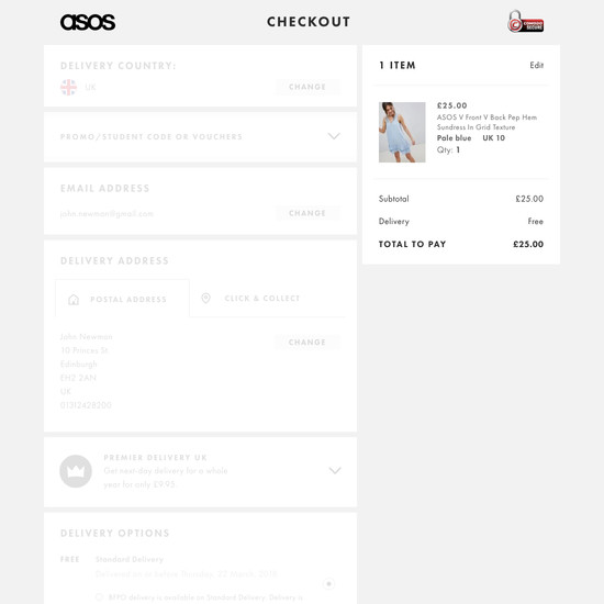 ASOS’s Cart & Checkout performance is mediocre. Notably, ASOS’s checkout performance is hampered by mediocre Validation Errors & Data Persistence and poor Order Confirmation & E-Mail, although this is helped somewhat by state of the art Shopping Cart & “Added to Cart” Behavior and Form & Page Design.