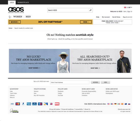 ASOS’s On-Site Search performance is mediocre. Notably, ASOS’s on-site search performance is hampered by broken Results Logic & Guidance, although this is helped somewhat by good Search Query Types.