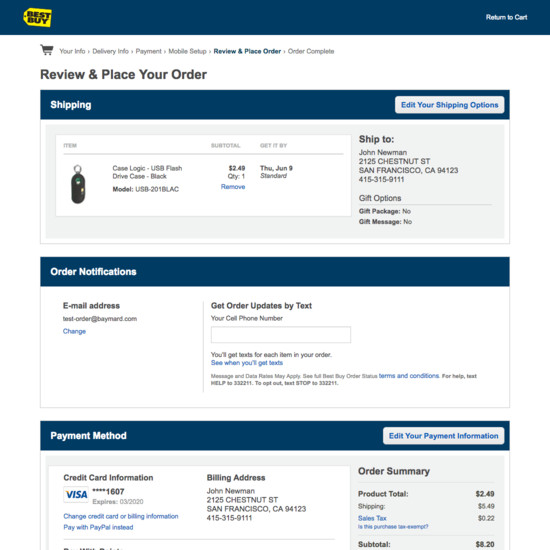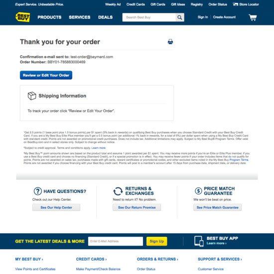 Best Buy’s Cart & Checkout performance is decent. For instance, Best Buy’s checkout has state of the art Credit Card Form and good User Interactions & Distractions yet suffers from mediocre Order Review and broken Order Confirmation & E-Mail.