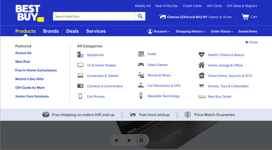 Best Buy’s Homepage & Category performance is acceptable. For instance, Best Buy’s category experience has good Intermediary Category Pages and decent Category Taxonomy yet suffers from broken Homepage.