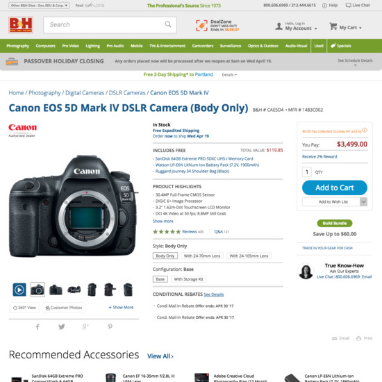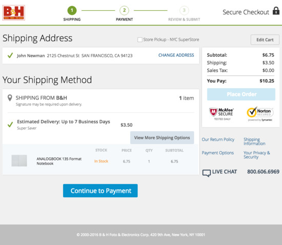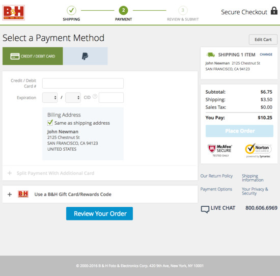 B&H Photo’s Cart & Checkout performance is good. It is especially a state of the art Field Design & Features, Payment Flow & Methods (Incl. 3rd-Party), and Credit Card Form that helps B&H Photo’s checkout UX. Do, however, watch out for their mediocre Order Review performance.