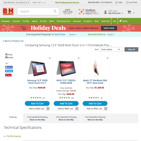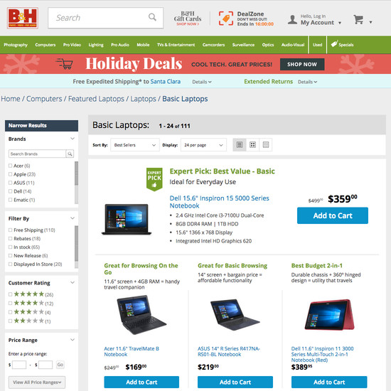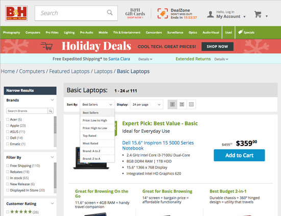 B&H Photo’s Product Lists & Filtering performance is decent. For instance, B&H Photo’s product listings have state of the art List Items: Personalization and Filtering: Available Filters yet suffer from mediocre Sorting and broken Loading Products.