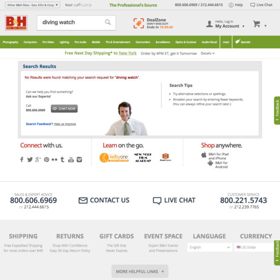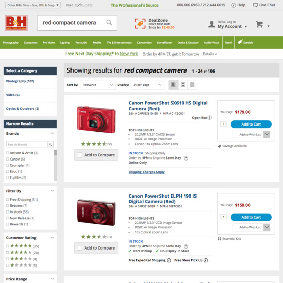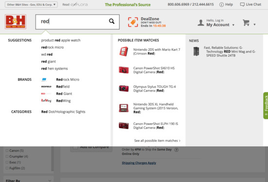 B&H Photo’s On-Site Search performance is acceptable. Notably, B&H Photo’s on-site search performance is hampered by poor Results Layout & Filtering, although this is helped somewhat by good Search Autocomplete.