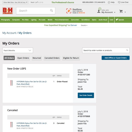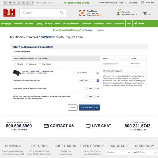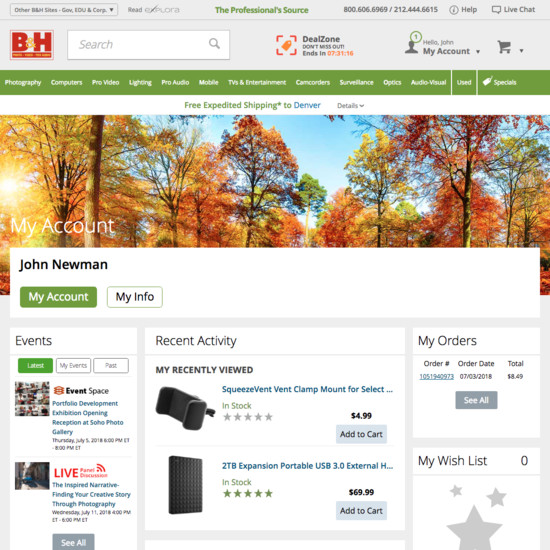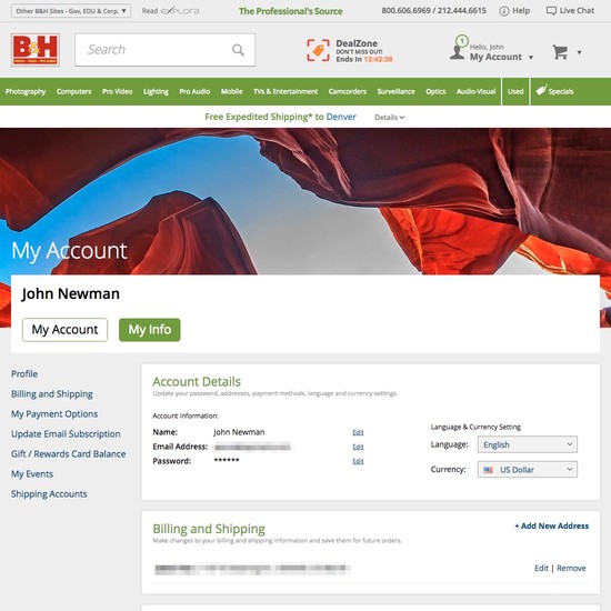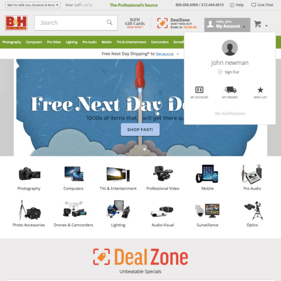 B&H Photo’s Accounts & Self-Service performance is acceptable. Notably, B&H Photo’s account performance is hampered by mediocre Account Dashboard and poor Order Returns, although this is helped somewhat by state of the art Account Drop-Down.