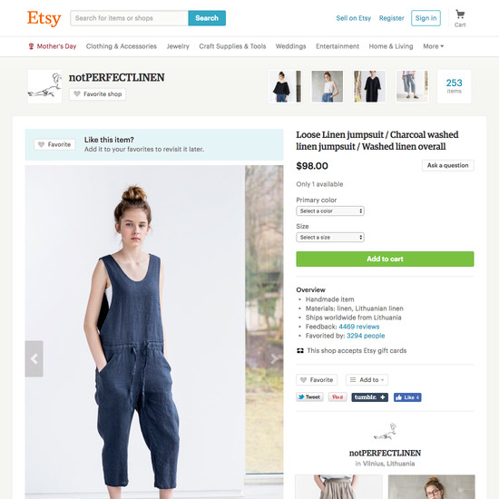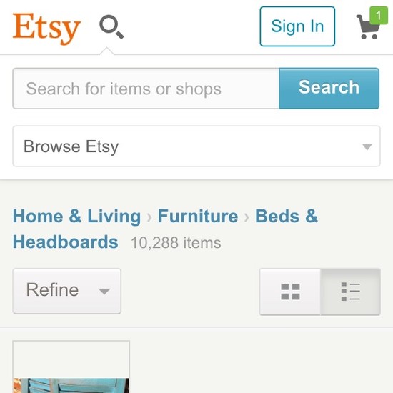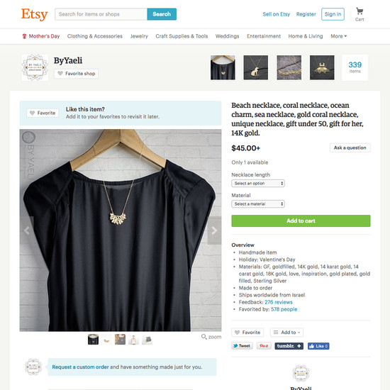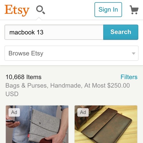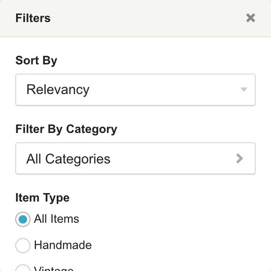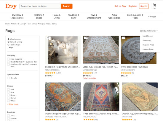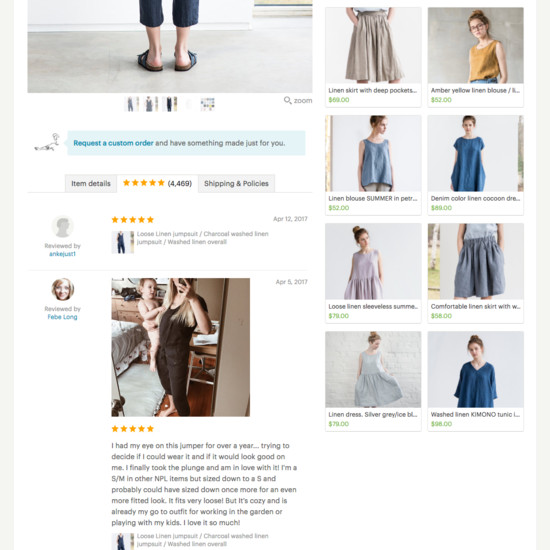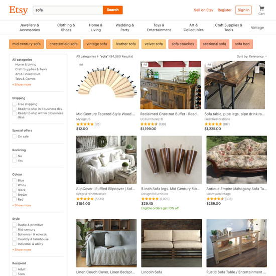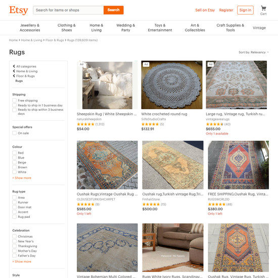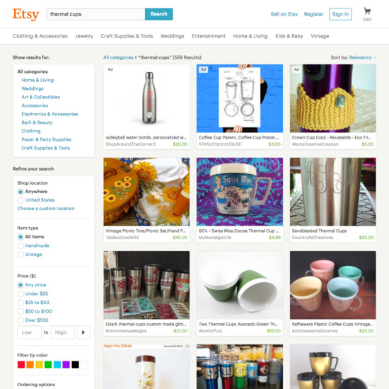 Etsy’s Product Lists & Filtering performance is acceptable. For instance, Etsy’s product listings have state of the art Filtering: Scope & Logic and good Comparison Tool yet suffer from mediocre List Items: Personalization and Filtering: Available Filters.