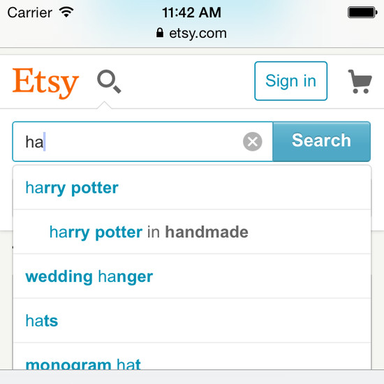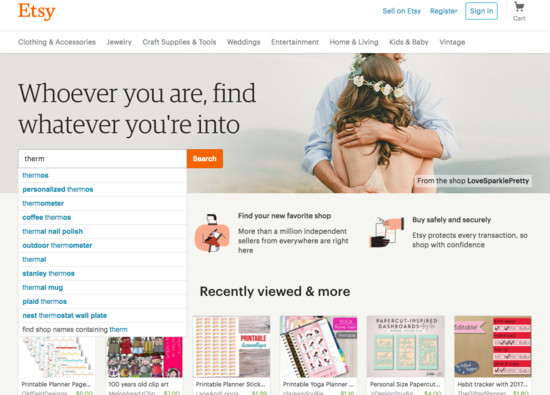 Etsy’s On-Site Search performance is acceptable. Notably, Etsy’s on-site search performance is hampered by mediocre Results Logic & Guidance and Results Layout & Filtering, although this is helped somewhat by state of the art Search Autocomplete and good Search Form & Logic.