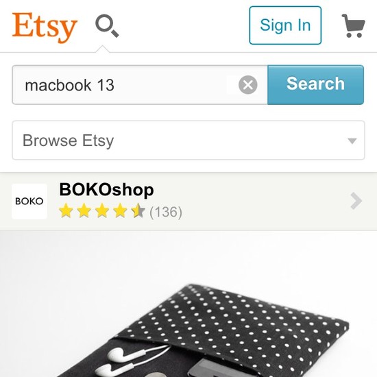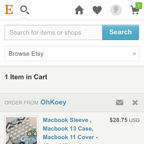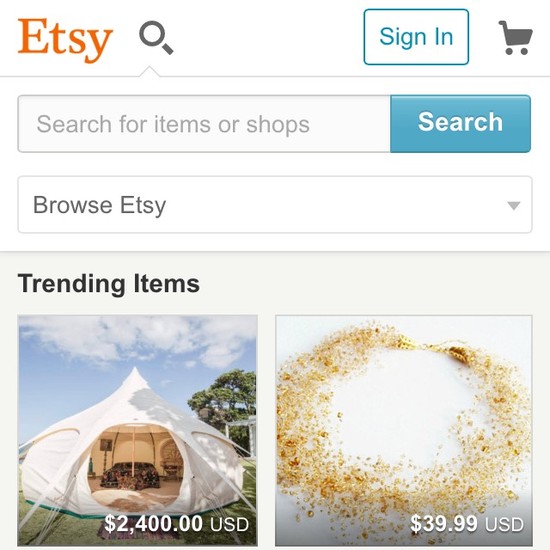 Etsy’s Mobile E-Commerce performance is acceptable. Notably, Etsy’s mobile performance is hampered by poor Mobile Shopping Cart, Cost & Account and broken Mobile Filtering & Sorting, although this is helped somewhat by good Mobile Product Descriptions, Specs, & Images and Mobile Homepage, Navigation, & Search.