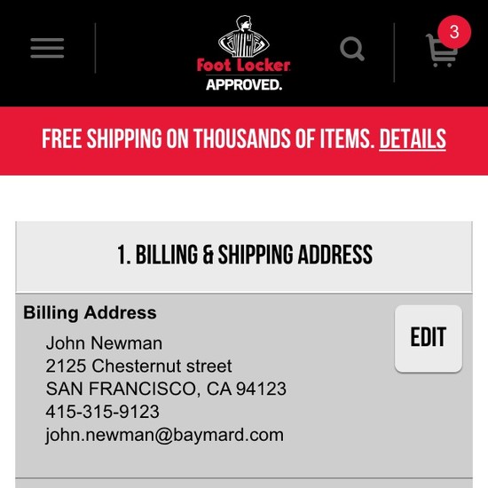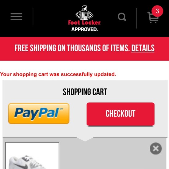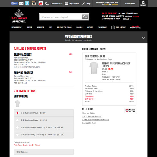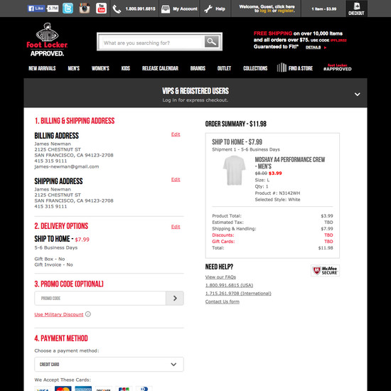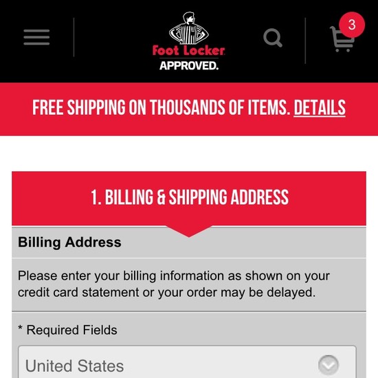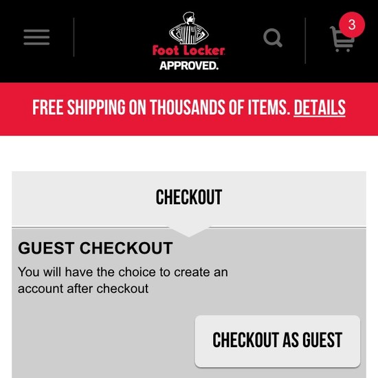 Foot Locker’s Cart & Checkout performance is poor. Foot Locker’s checkout is particularly thwarted by usability issues related to mediocre Shopping Cart & “Added to Cart” Behavior, poor Order Review, and poor Order Confirmation & E-Mail. That said, their checkout performs great within Cross-Sells.