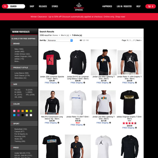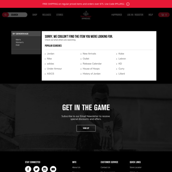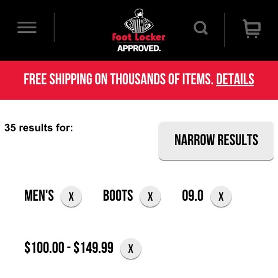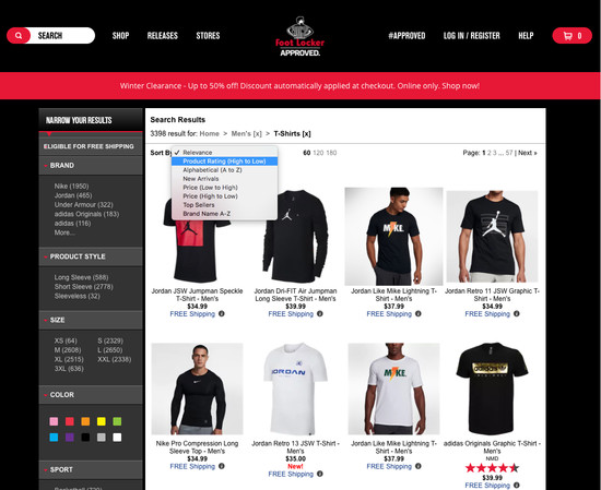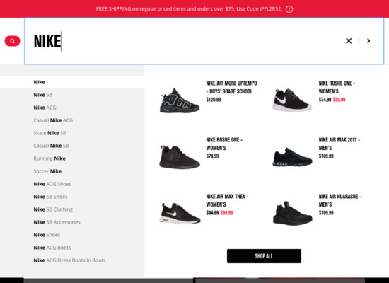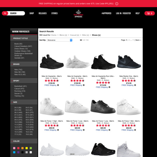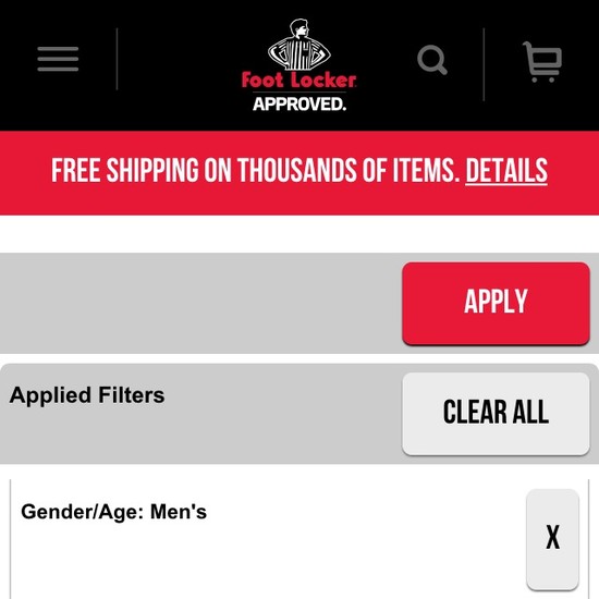 Foot Locker’s On-Site Search performance is poor. Foot Locker’s search experience in particular suffers from usability issues caused by mediocre Results Layout & Filtering, poor Search Autocomplete, and broken Search Form & Logic.