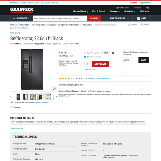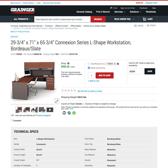 Grainger’s Product Page performance is poor. Grainger’s product page experience is particularly thwarted by usability issues related to poor Product Variations, The ‘Buy’ Section, and Cross-Sells & Cross-Navigation. That said, their product page experience performs well within Product Video & 360-View.