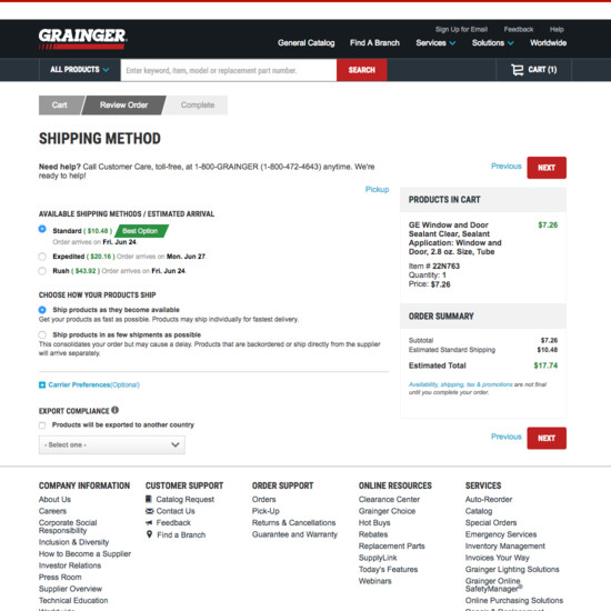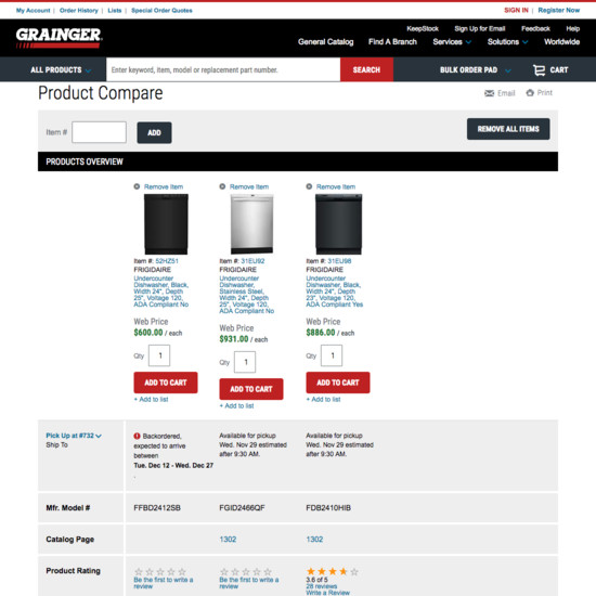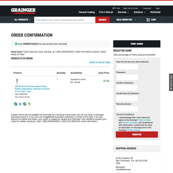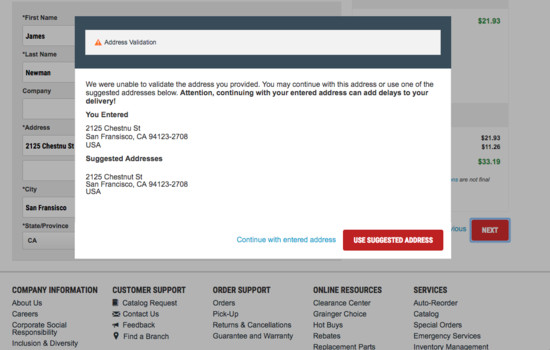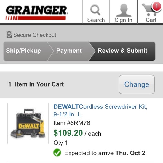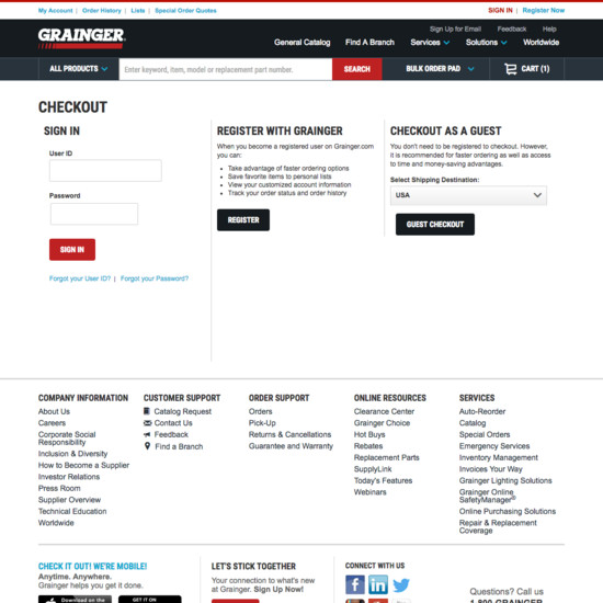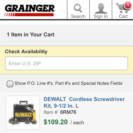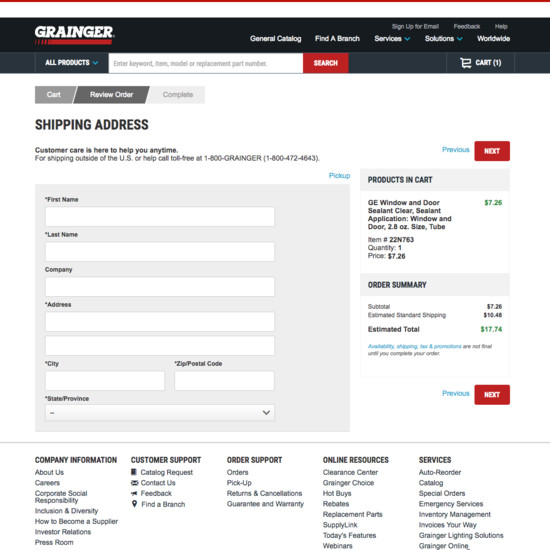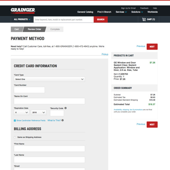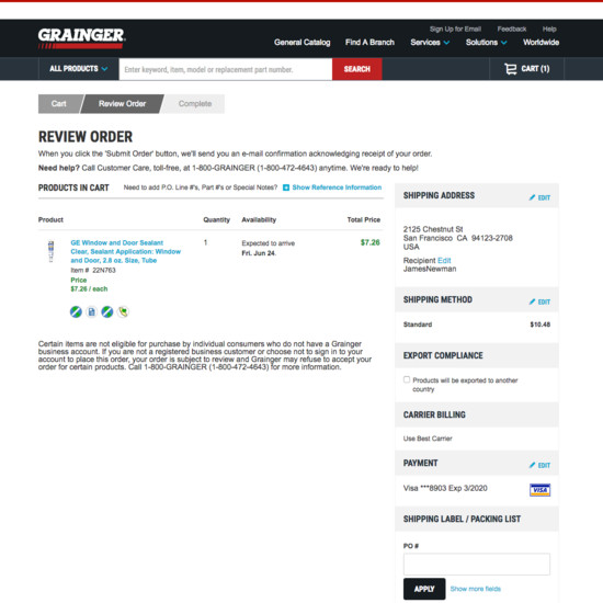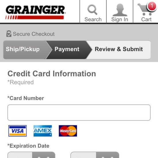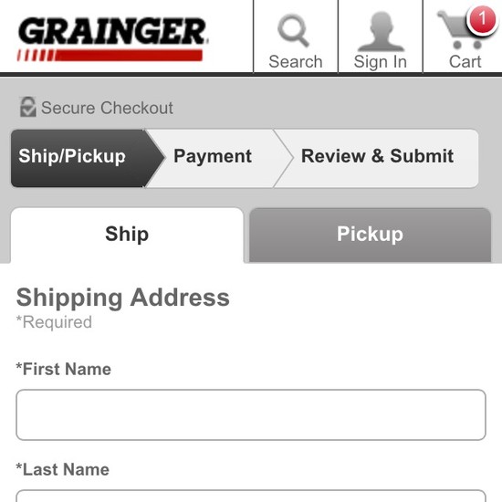 Grainger’s Cart & Checkout performance is broken. Grainger’s checkout in particular suffers from usability issues caused by mediocre Form & Page Design, Field Labels & Microcopy, and Order Review. That said, their checkout performs great within Cross-Sells.