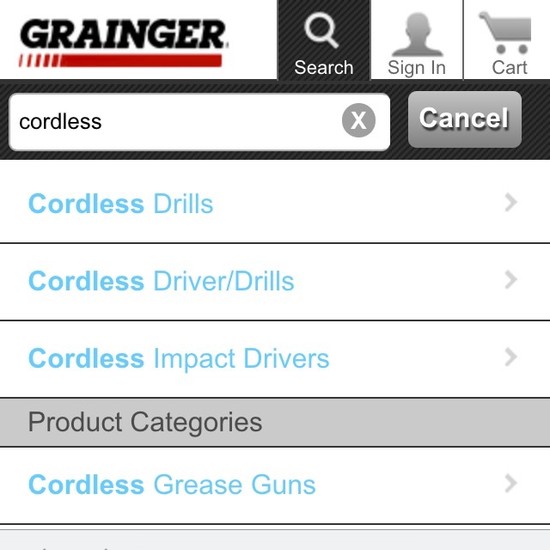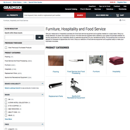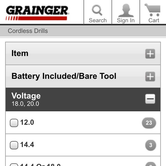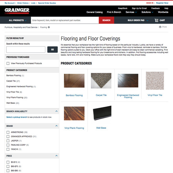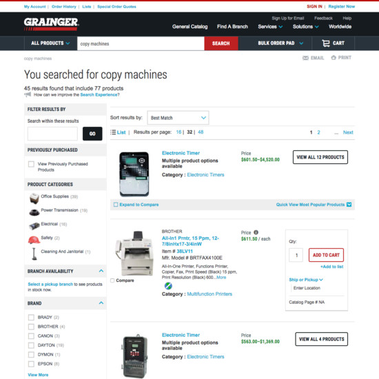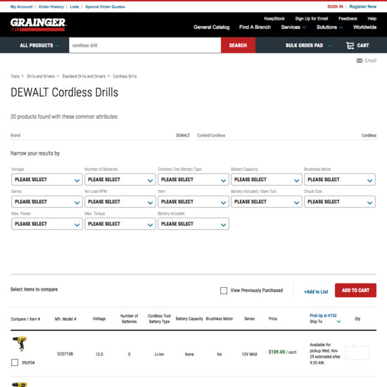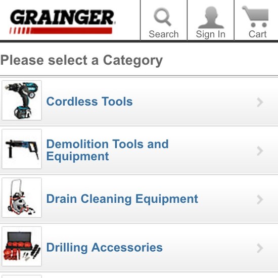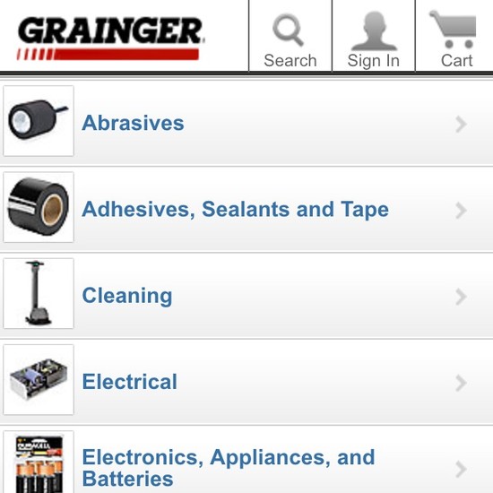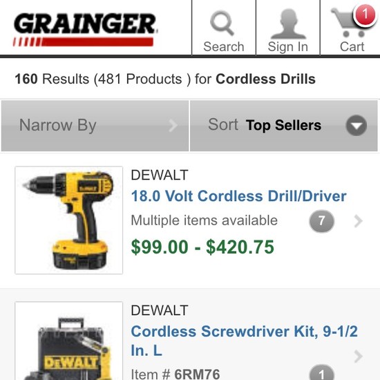 Grainger’s Product Lists & Filtering performance is mediocre. Some of Grainger’s biggest product list usability issues are due to poor Filtering: Available Filters, poor List Items: Interface & Hit Areas, and broken List Items: Personalization. That said, their product listings perform well within List Layout.