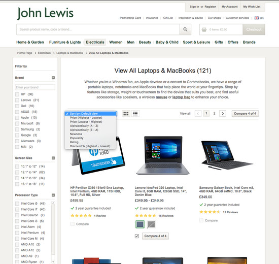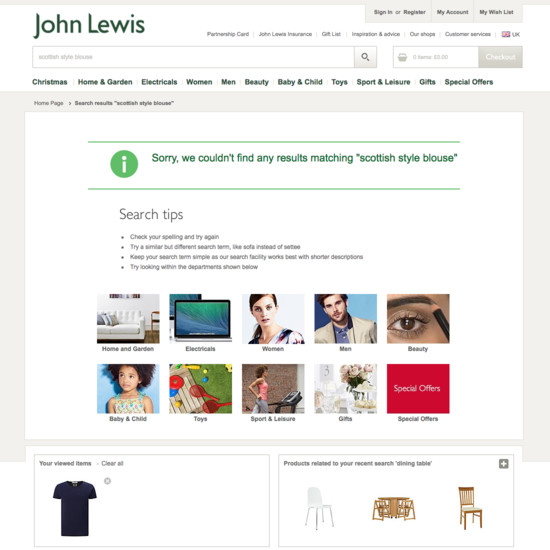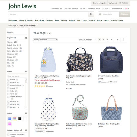 John Lewis’ Product Lists & Filtering performance is acceptable. Notably, John Lewis’ product list performance is hampered by poor Filtering: Available Filters and broken Sorting, although this is helped somewhat by good List Items: Product Info & Thumbnails and List Items: Personalization.