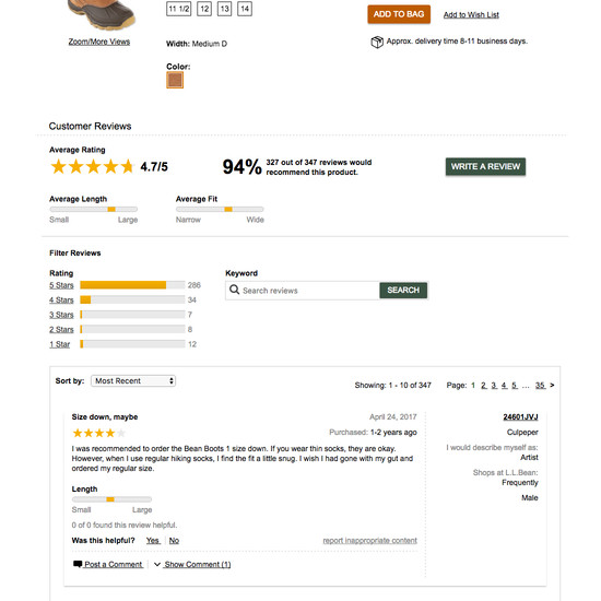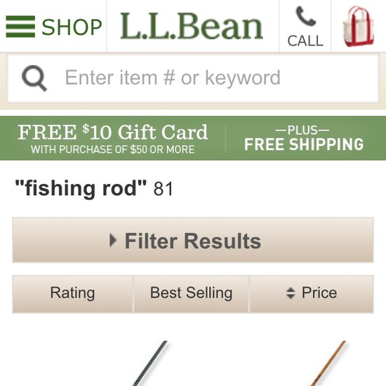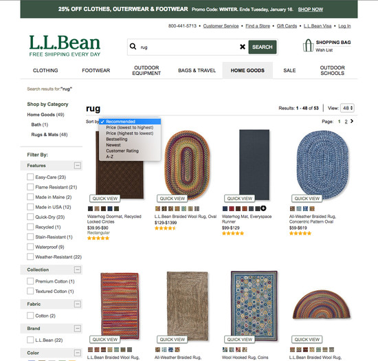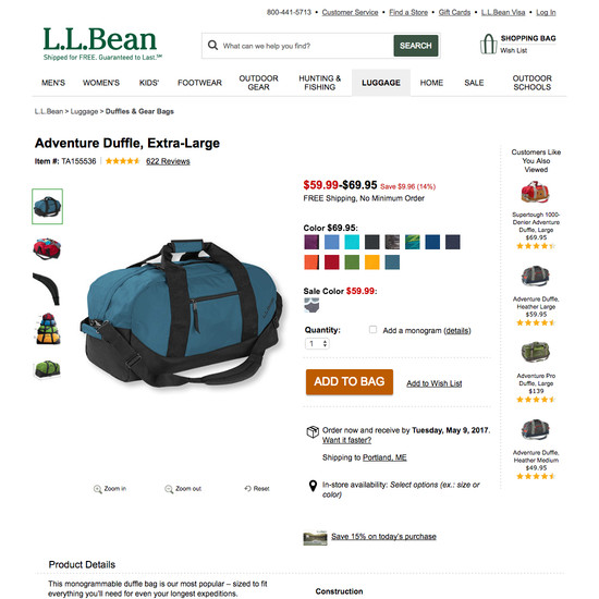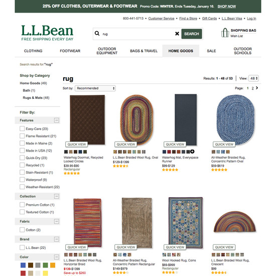 L.L. Bean’s Product Lists & Filtering performance is acceptable. Notably, L.L. Bean’s product list performance is hampered by mediocre Sorting and Loading Products, although this is helped somewhat by state of the art Filtering: Scope & Logic and good Filtering: Interface & Layout.
