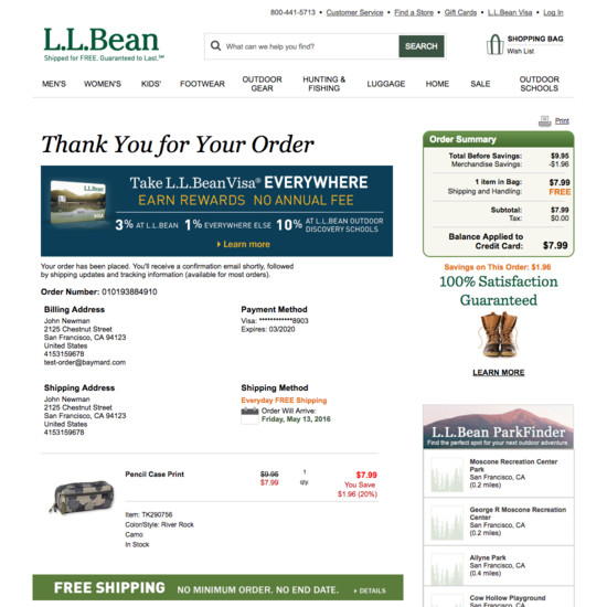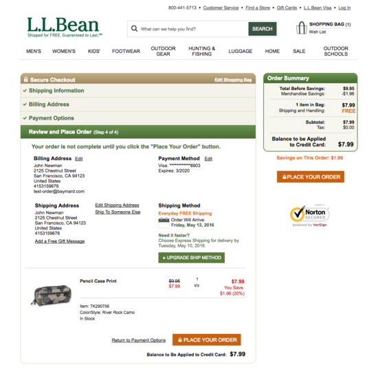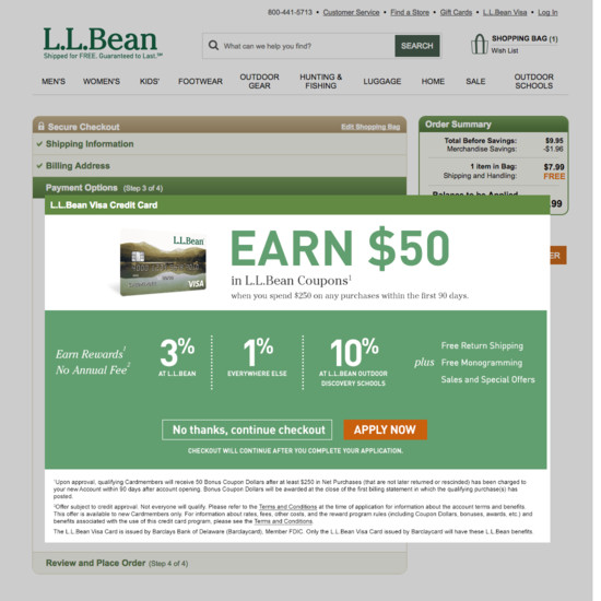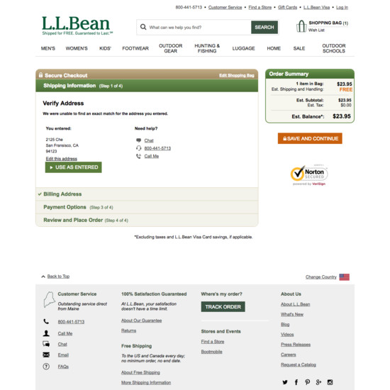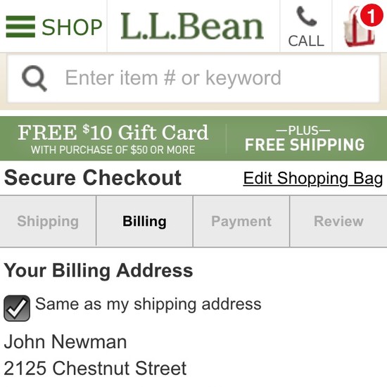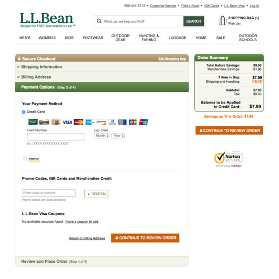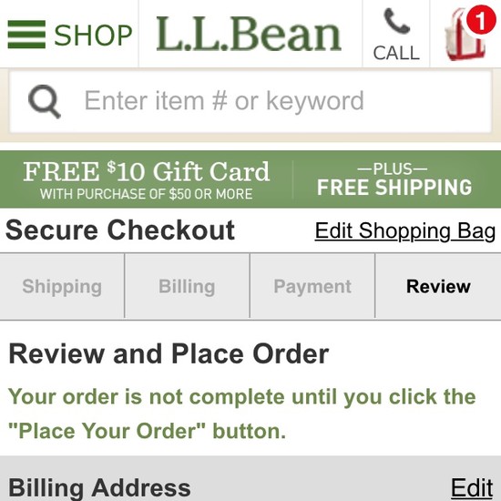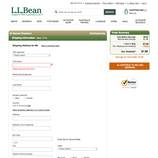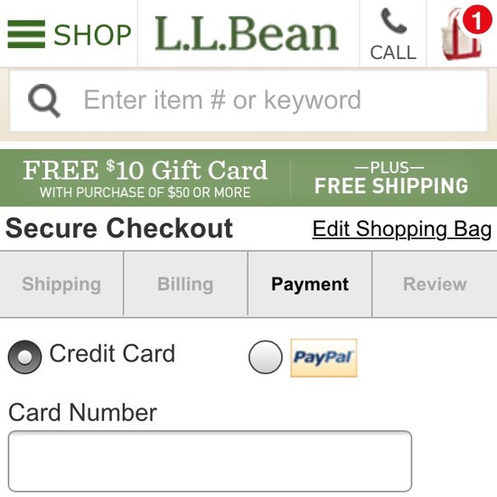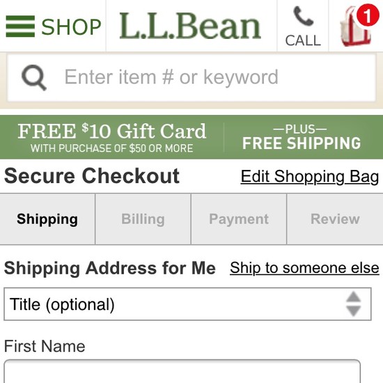 L.L. Bean’s Cart & Checkout performance is mediocre. Notably, L.L. Bean’s checkout performance is hampered by mediocre Form & Page Design and Gifting Flow & Features, although this is helped somewhat by good Order Review and Order Confirmation & E-Mail.