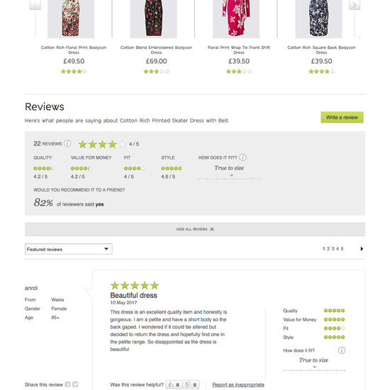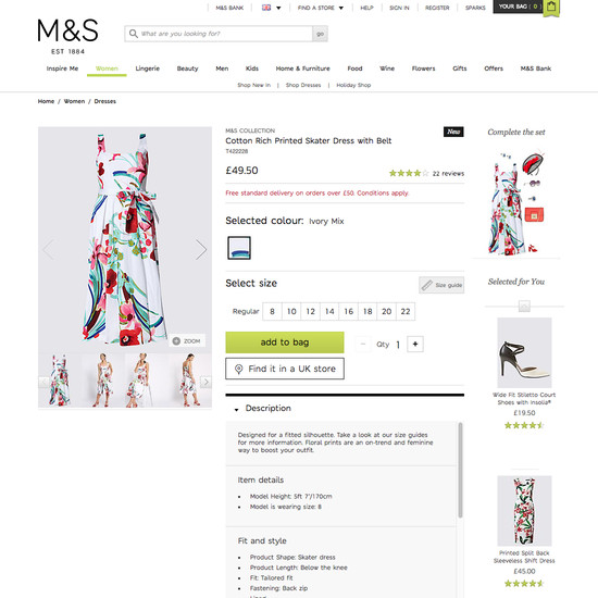 Marks & Spencer’s Product Page performance is acceptable. Notably, Marks & Spencer’s product page performance is hampered by mediocre Specifications Sheet and poor Auxiliary Content, although this is helped somewhat by good Image Gallery UI and Product Descriptions.