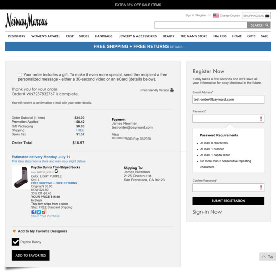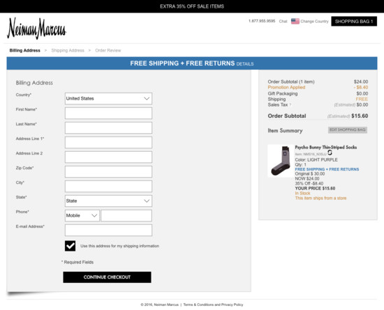 Neiman Marcus’ Cart & Checkout performance is mediocre. Notably, Neiman Marcus’ checkout performance is hampered by mediocre Credit Card Form and Field Labels & Microcopy, although this is helped somewhat by state of the art Shipping & Store Pickup and Cross-Sells.