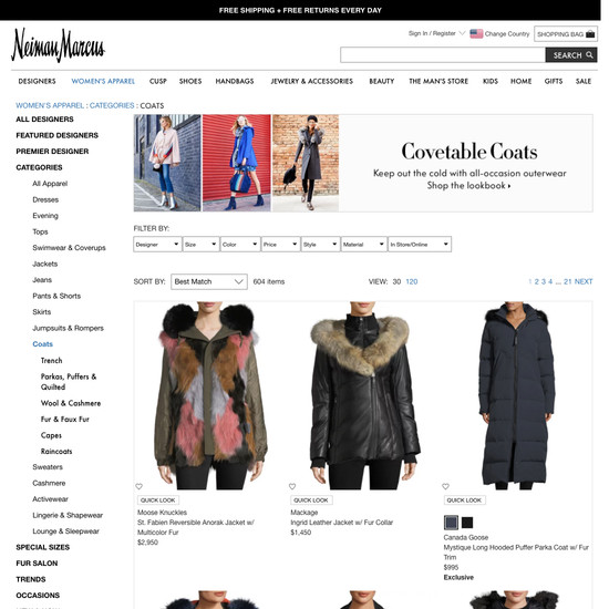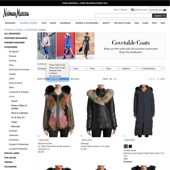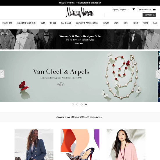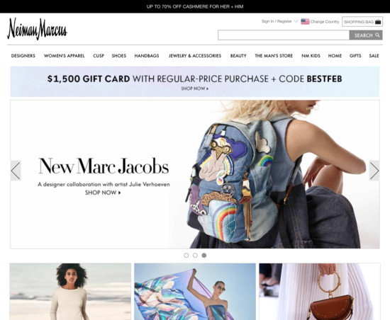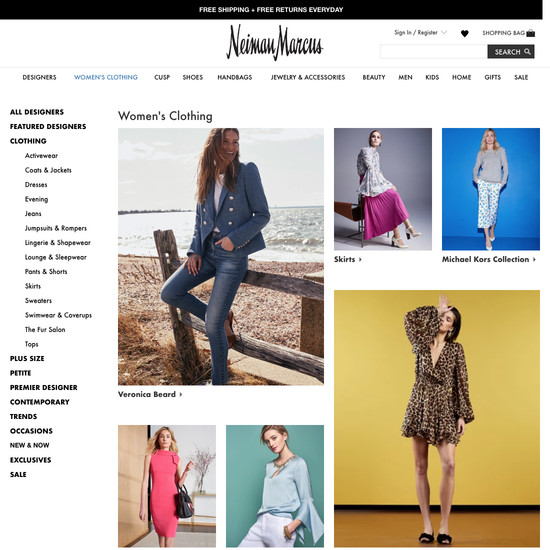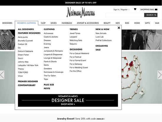 Neiman Marcus’ Homepage & Category performance is acceptable. For instance, Neiman Marcus’ category experience has good Main Navigation and decent Site-Wide Layout yet suffers from mediocre Homepage and broken Intermediary Category Pages.