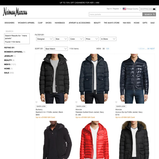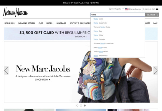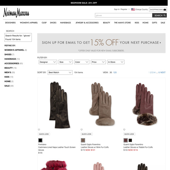 Neiman Marcus’ On-Site Search performance is broken. Neiman Marcus’ search experience in particular suffers from usability issues caused by mediocre Search Form & Logic, poor Search Query Types, and poor Results Logic & Guidance.