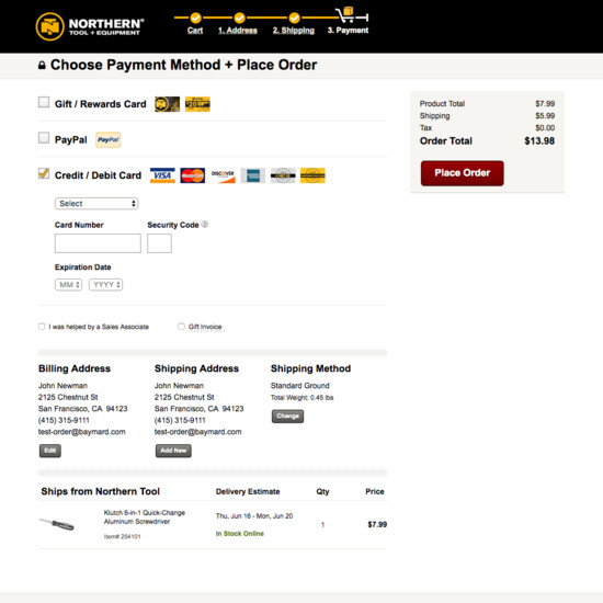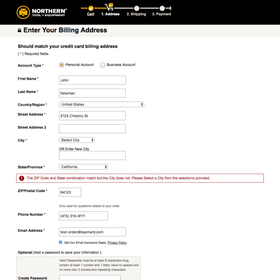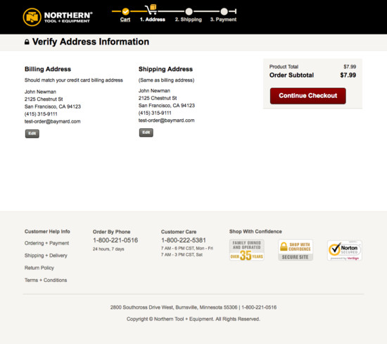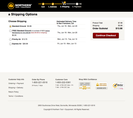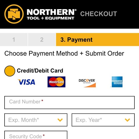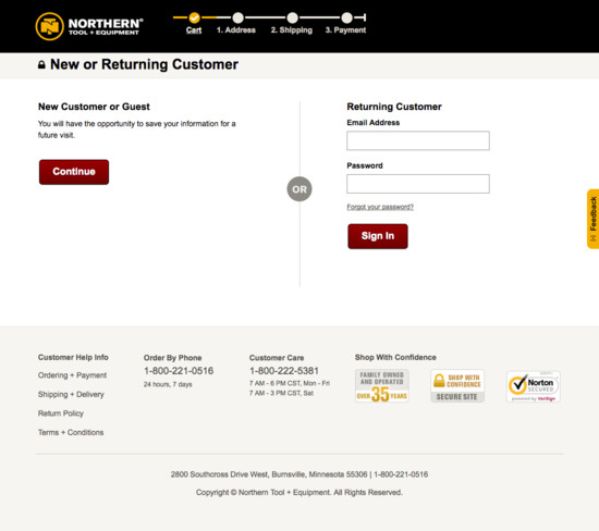 Northern Tool’s Cart & Checkout performance is mediocre. Notably, Northern Tool’s checkout performance is hampered by mediocre Field Labels & Microcopy and Account Selection & Creation, although this is helped somewhat by state of the art Cross-Sells and good User Interactions & Distractions.