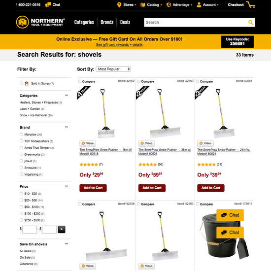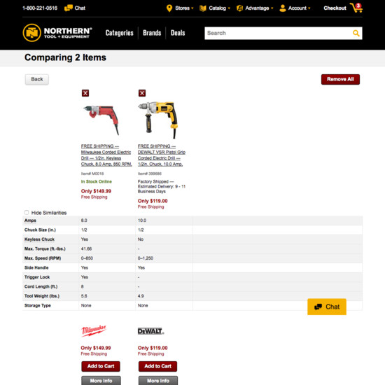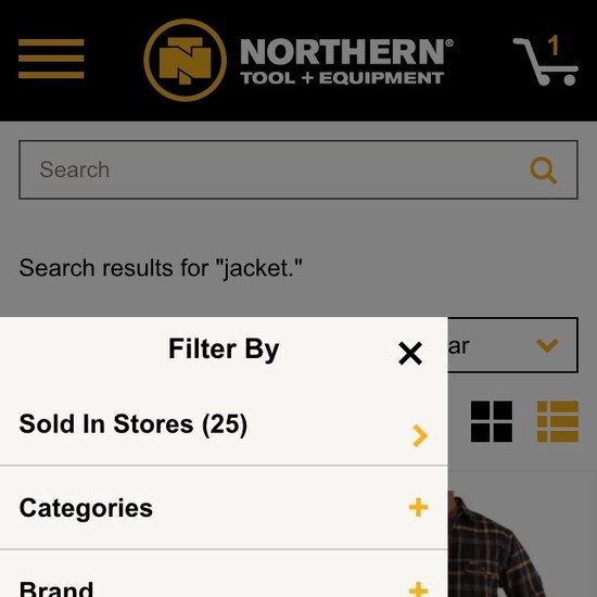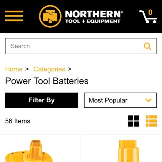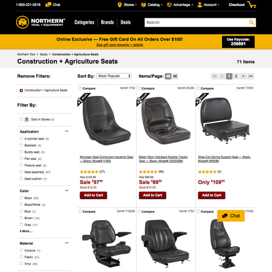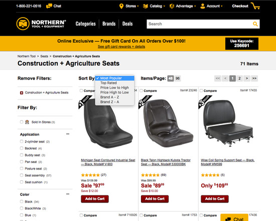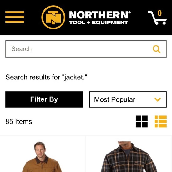 Northern Tool’s Product Lists & Filtering performance is mediocre. Notably, Northern Tool’s product list performance is hampered by mediocre List Layout and Loading Products, although this is helped somewhat by good List Items: Product Info & Thumbnails.