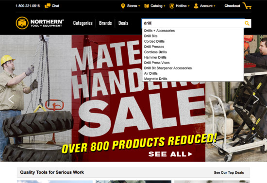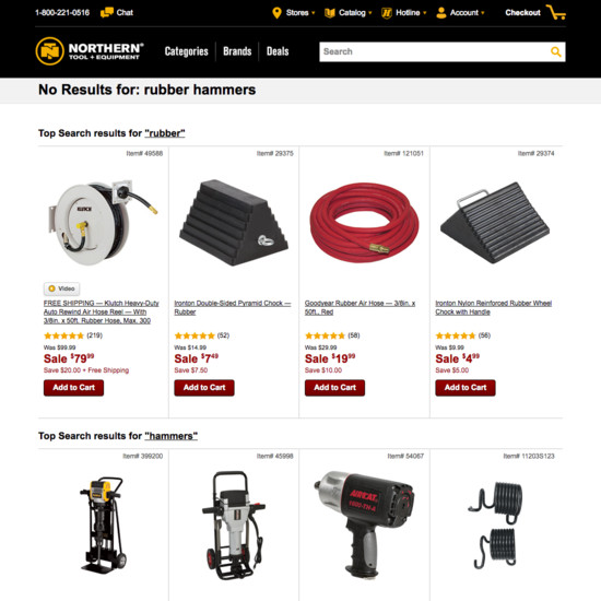 Northern Tool’s On-Site Search performance is poor. Northern Tool’s search experience in particular suffers from usability issues caused by poor Search Query Types and broken Results Layout & Filtering. That said, their search experience performs well within Results Logic & Guidance.