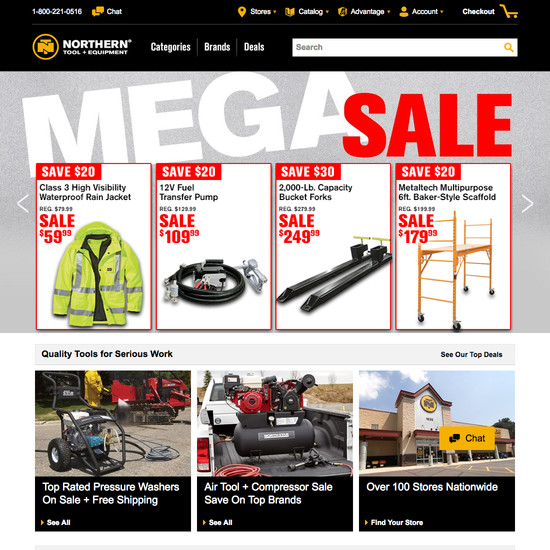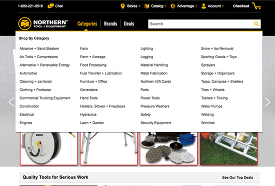 Northern Tool’s Homepage & Category performance is acceptable. For instance, Northern Tool’s category experience has decent Category Taxonomy yet suffers from poor Main Navigation.