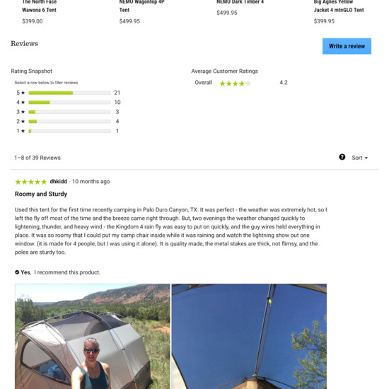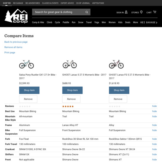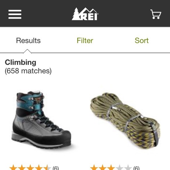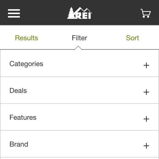REI’s Product Lists & Filtering performance is acceptable. Notably, REI’s product list performance is hampered by poor Loading Products and Comparison Tool, although this is helped somewhat by state of the art Filtering: Scope & Logic and good Sorting.