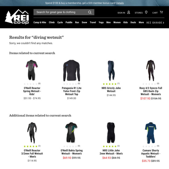 REI’s On-Site Search performance is poor. REI’s search experience is particularly thwarted by usability issues related to broken Search Form & Logic and Results Layout & Filtering.