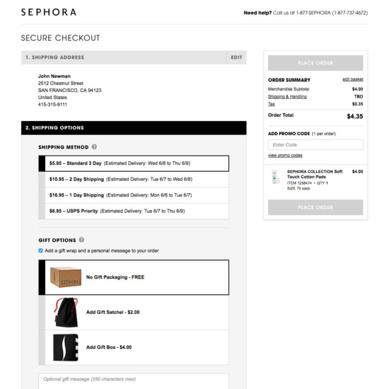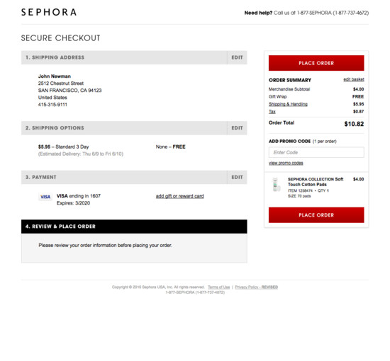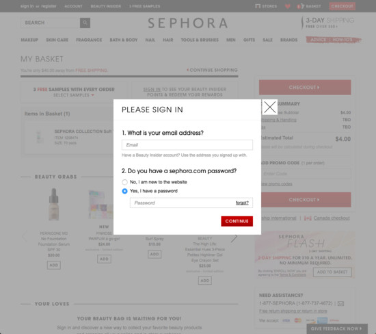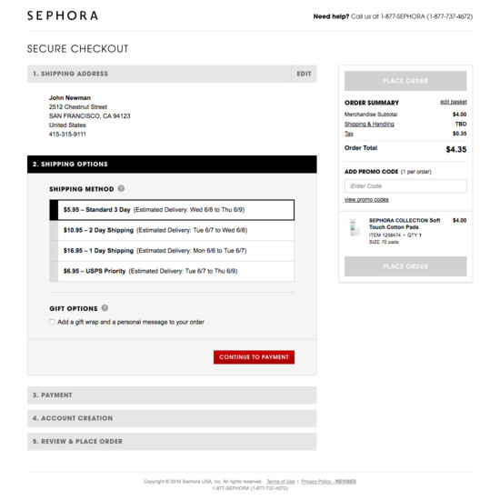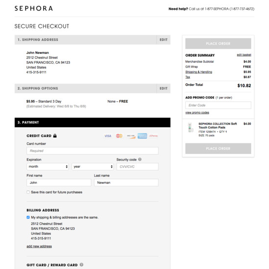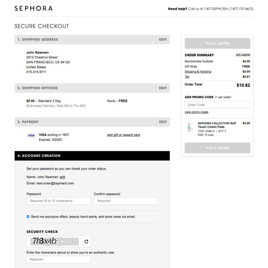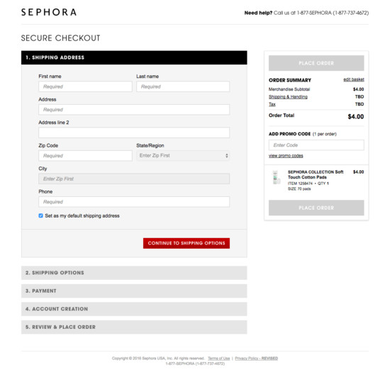 Sephora’s Cart & Checkout performance is decent. For instance, Sephora’s checkout has state of the art User Interactions & Distractions and Default Values & Autocompletion yet suffers from mediocre Credit Card Form and broken Account Selection & Creation.
