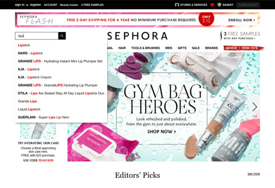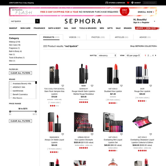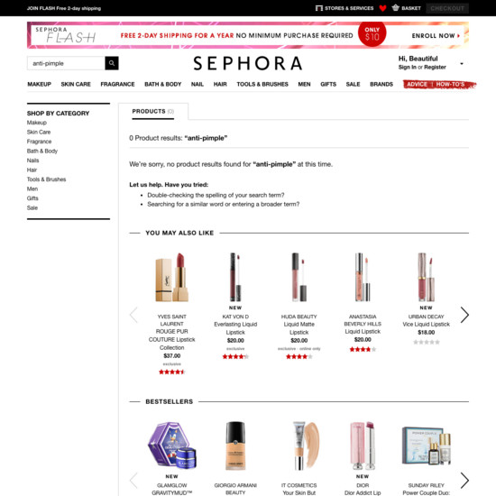 Sephora’s On-Site Search performance is poor. Some of Sephora’s biggest on-site search usability issues are due to mediocre Results Layout & Filtering, mediocre Results Logic & Guidance, and broken Search Form & Logic.