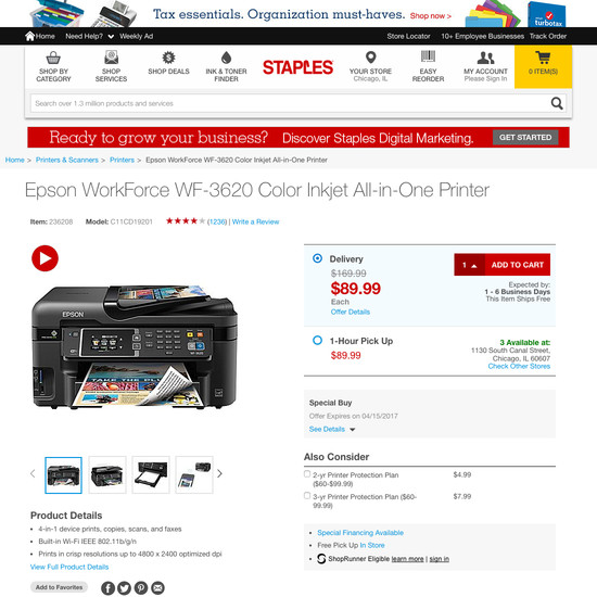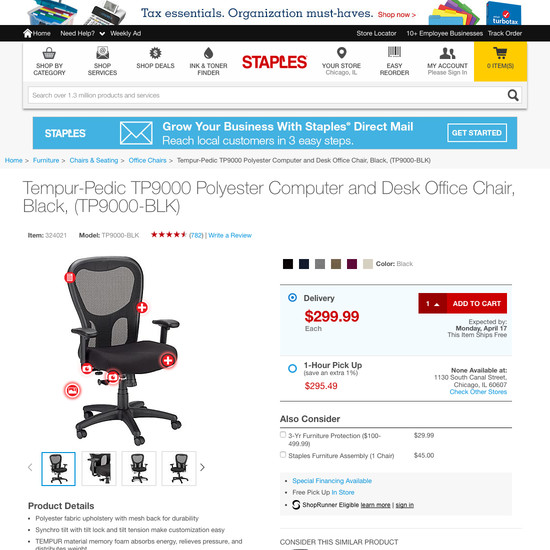 Staples’ Product Page performance is poor. Staples’ product page experience is particularly thwarted by usability issues related to mediocre The ‘Buy’ Section, mediocre Product Images, and poor Image Gallery UI. That said, their product page experience performs great within Product Descriptions.