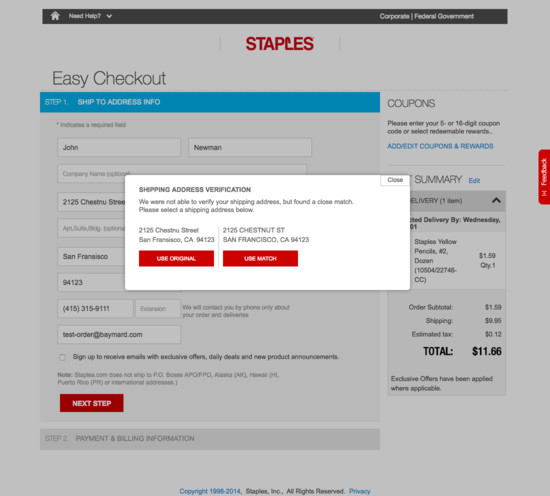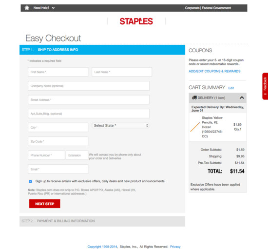 Staples’ Cart & Checkout performance is decent. It is especially a state of the art Validation Errors & Data Persistence, Payment Flow & Methods (Incl. 3rd-Party), and Cross-Sells that helps Staples’ checkout UX. Do, however, watch out for their poor Order Review performance.