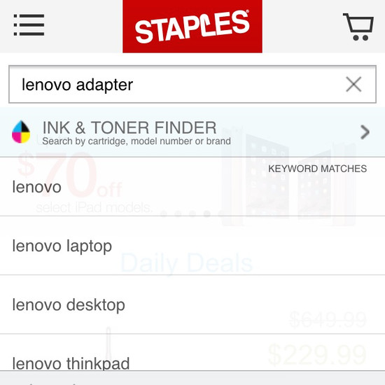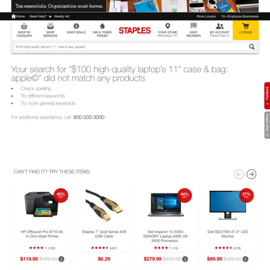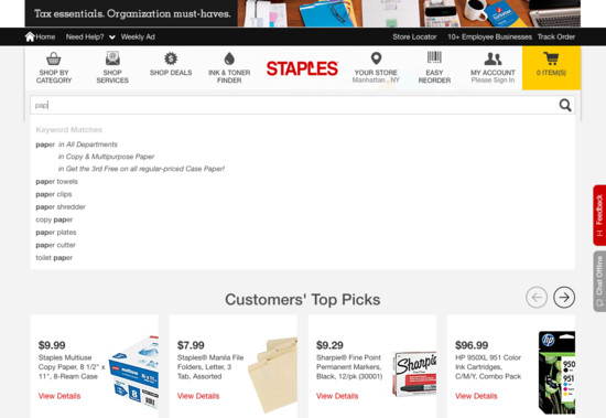 Staples’ On-Site Search performance is acceptable. Notably, Staples’ search experience has good Search Form & Logic and decent Search Autocomplete.
