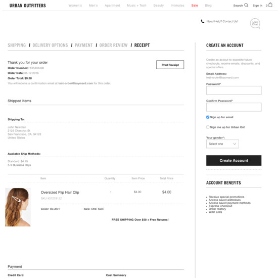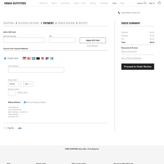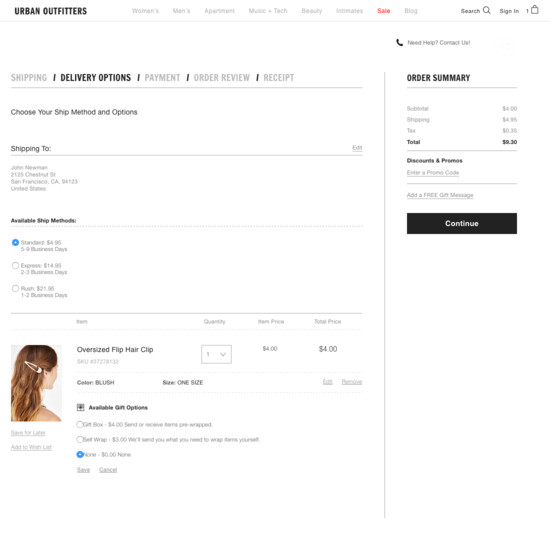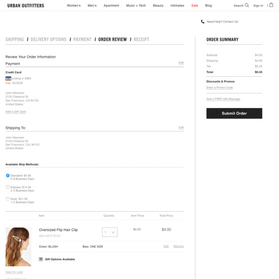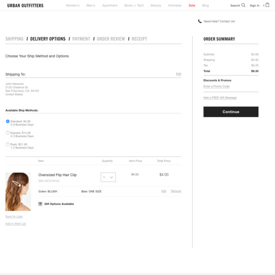 Urban Outfitters’ Cart & Checkout performance is acceptable. Notably, Urban Outfitters’ checkout performance is hampered by poor Shipping & Store Pickup and Credit Card Form, although this is helped somewhat by state of the art Default Values & Autocompletion and good Cross-Sells.