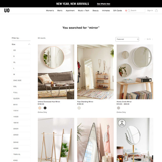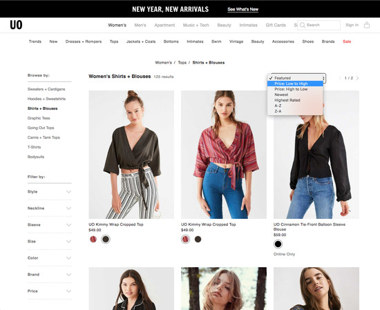 Urban Outfitters’ Product Lists & Filtering performance is acceptable. For instance, Urban Outfitters’ product listings have state of the art List Layout and good Comparison Tool yet suffer from mediocre Loading Products and broken Sorting.