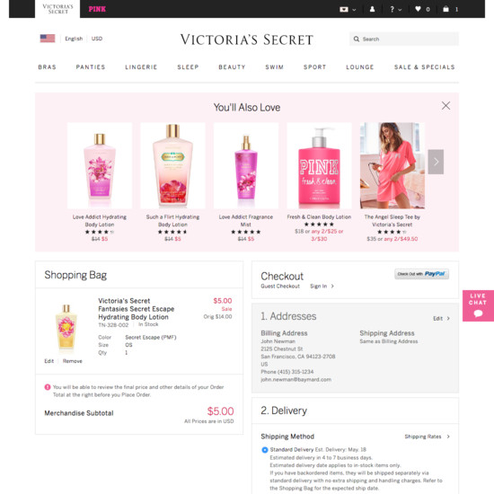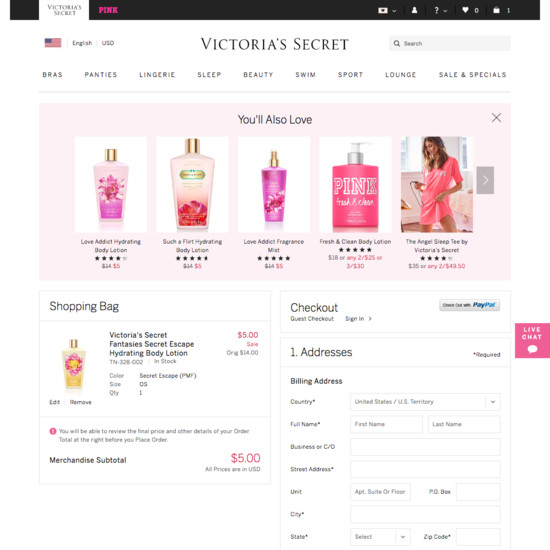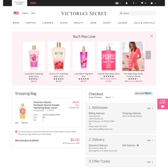 Victoria’s Secret’s Cart & Checkout performance is broken. Some of Victoria’s Secret’s biggest checkout usability issues are due to mediocre Field Design & Features, mediocre Default Values & Autocompletion, and poor Gifting Flow & Features.