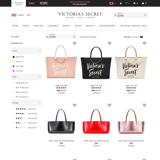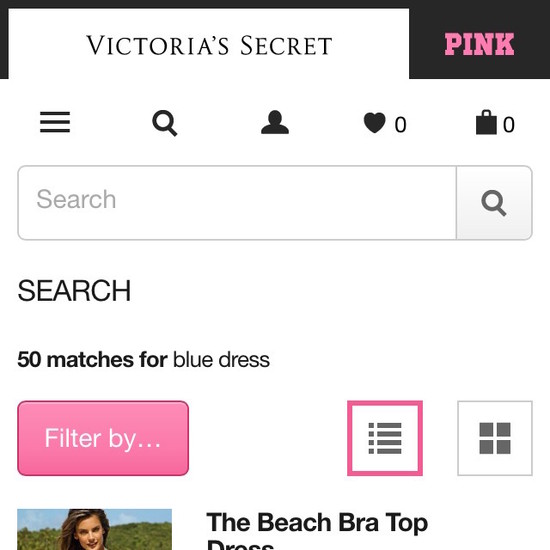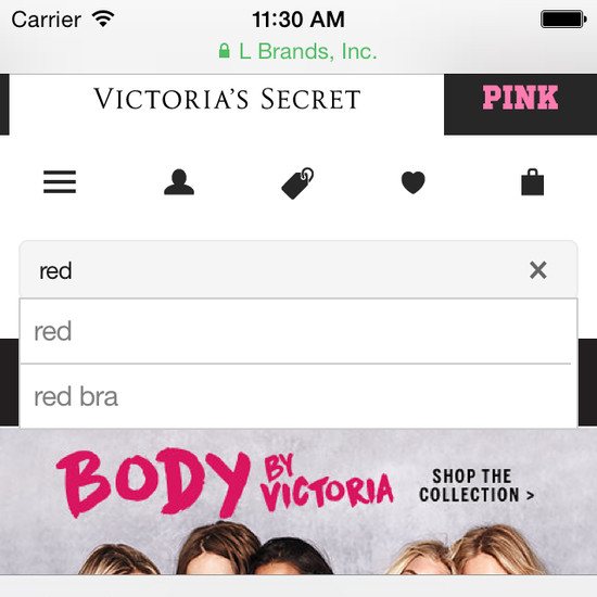 Victoria’s Secret’s Mobile E-Commerce performance is poor. Victoria’s Secret’s mobile design is particularly thwarted by usability issues related to mediocre Mobile Validation Errors, poor Mobile Filtering & Sorting, and poor Mobile Shopping Cart, Cost & Account. That said, their mobile design performs well within Mobile Product Lists.