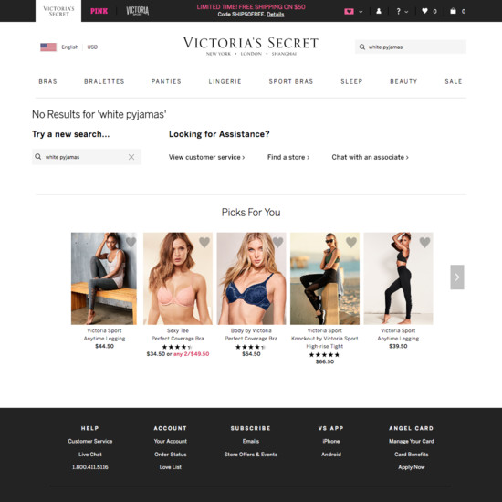 Victoria’s Secret’s On-Site Search performance is mediocre. Some of Victoria’s Secret’s biggest on-site search usability issues are due to mediocre Search Query Types and broken Results Logic & Guidance.