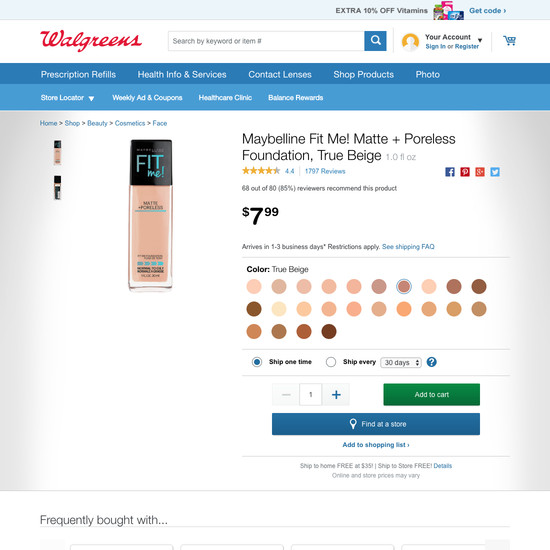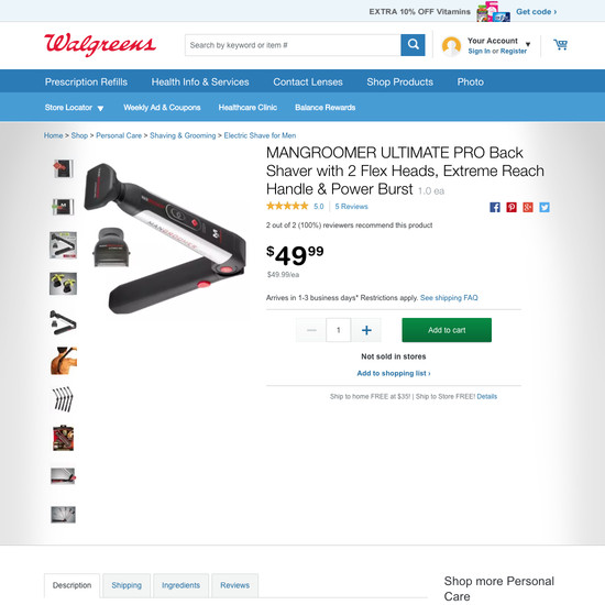 Walgreen Co.’s Product Page performance is mediocre. Notably, Walgreens’ product page performance is hampered by mediocre Specifications Sheet and Cross-Sells & Cross-Navigation, although this is helped somewhat by good User Reviews and Product Images.