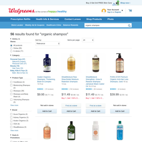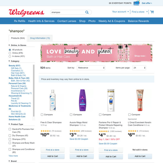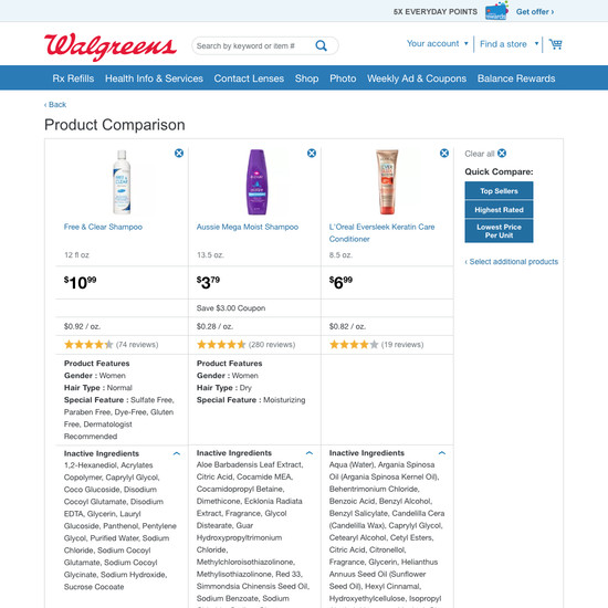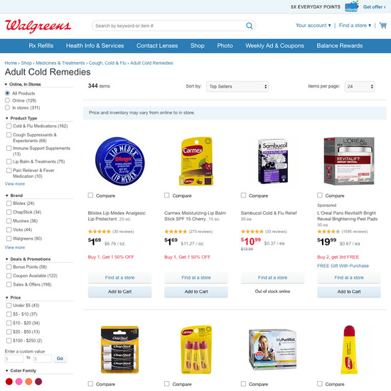 Walgreen Co.’s Product Lists & Filtering performance is acceptable. For instance, Walgreens’ product listings have state of the art Filtering: Scope & Logic and good List Items: Product Info & Thumbnails yet suffer from mediocre List Items: Personalization and poor Comparison Tool.