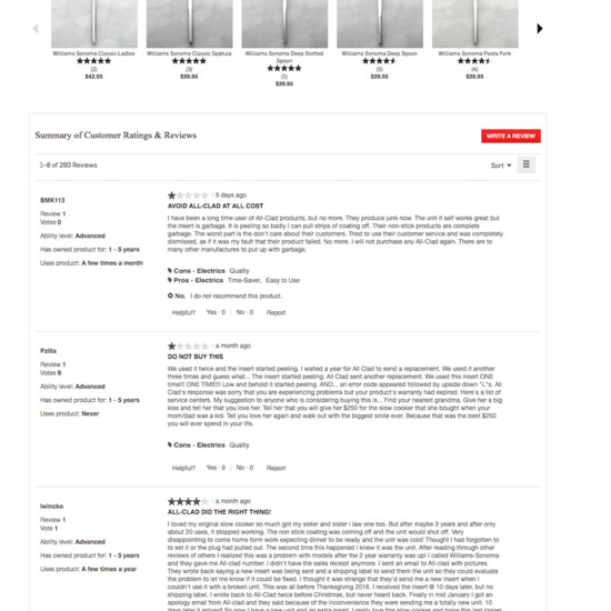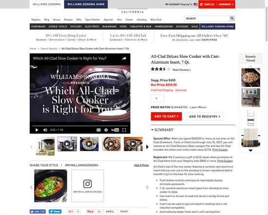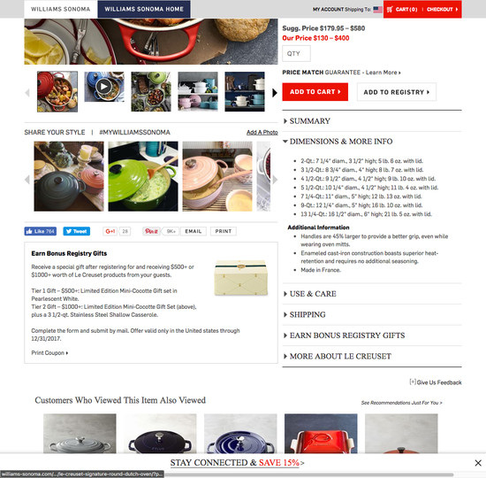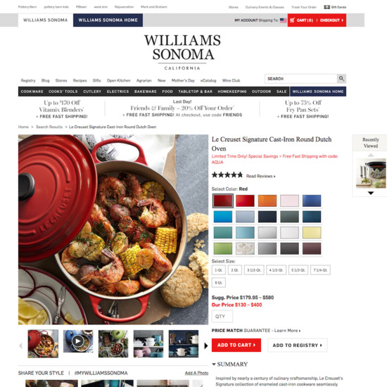 Williams-Sonoma’s Product Page performance is acceptable. For instance, Williams-Sonoma’s product page experience has state of the art Product Video & 360-View and Product Variations yet suffers from poor Product Page Layout and User Reviews.