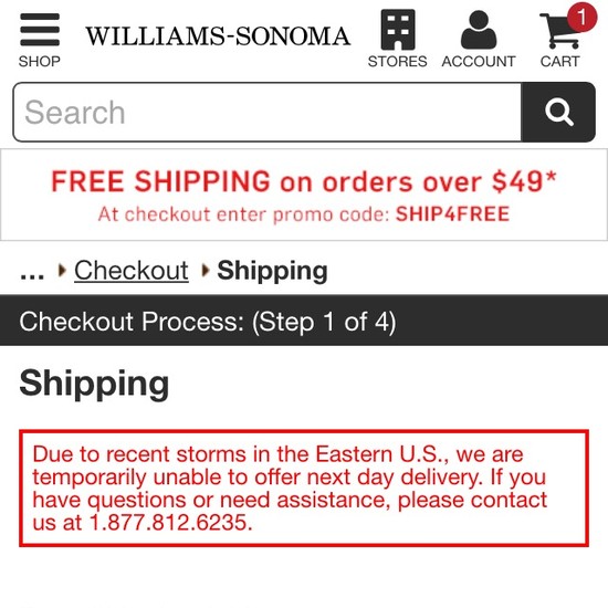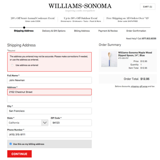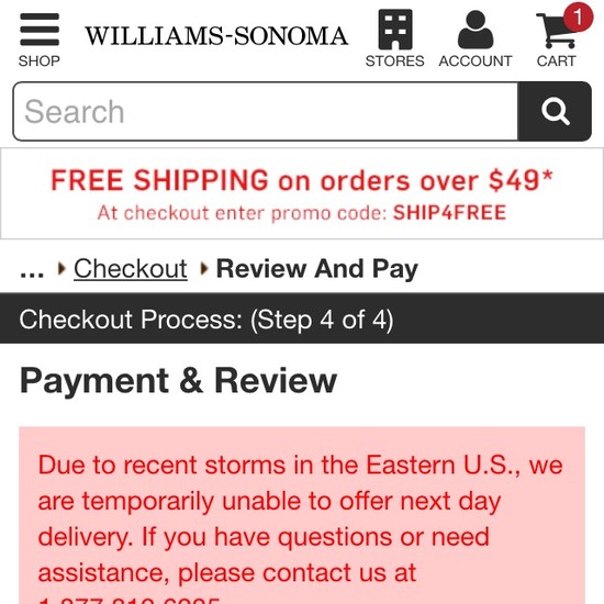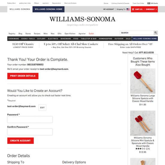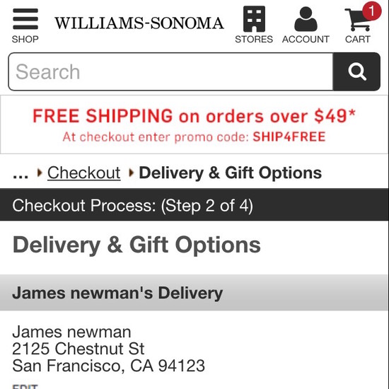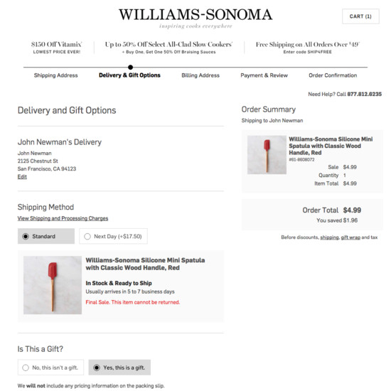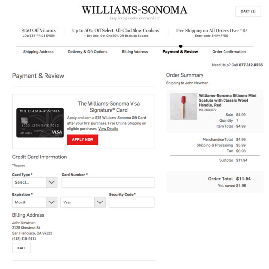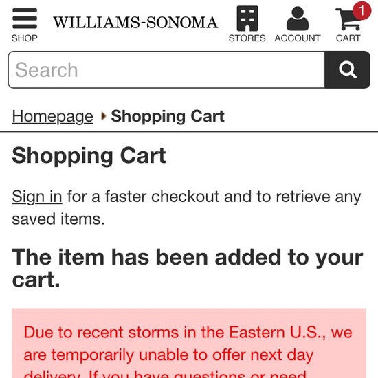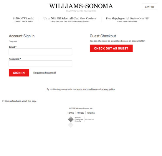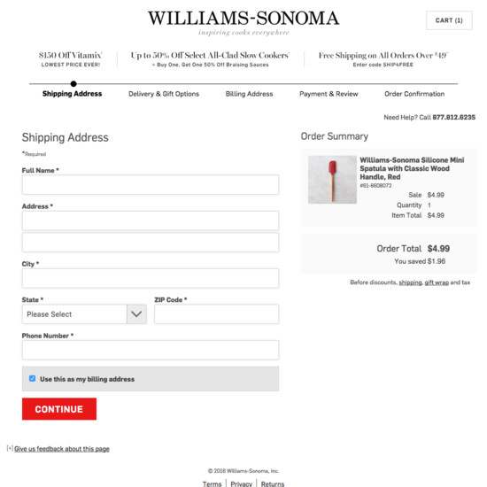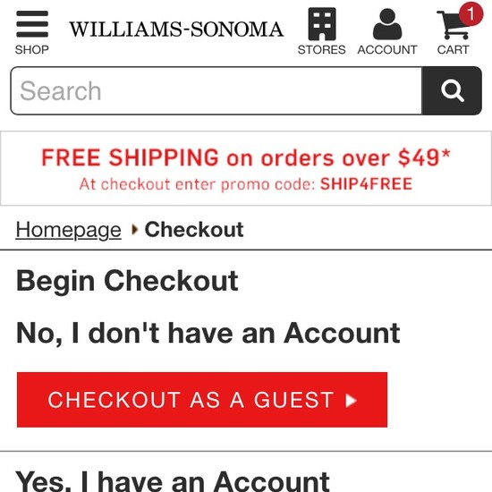 Williams-Sonoma’s Cart & Checkout performance is acceptable. For instance, Williams-Sonoma’s checkout has good Order Confirmation & E-Mail and Field Labels & Microcopy yet suffers from mediocre Order Review and poor Shopping Cart & “Added to Cart” Behavior.