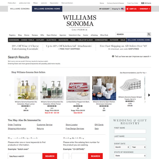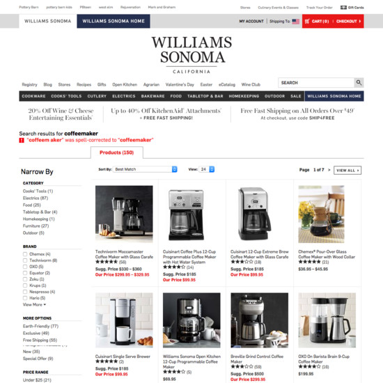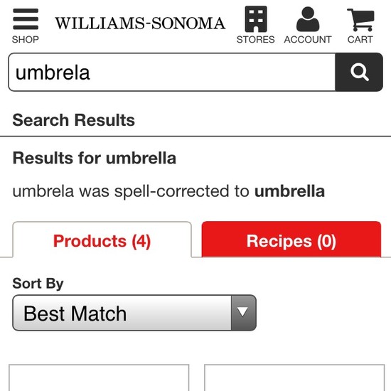 Williams-Sonoma’s On-Site Search performance is poor. Williams-Sonoma’s search experience is particularly thwarted by usability issues related to broken Search Query Types and Results Layout & Filtering.